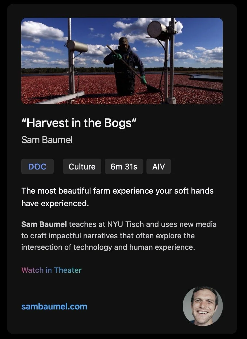 “Harvest in the Bogs” was selected for curation on Theater, a selective platform for immersive content on Apple Vision Pro, signaling both creative and technical excellence within the emerging immersive media and spatial computing ecosystem.